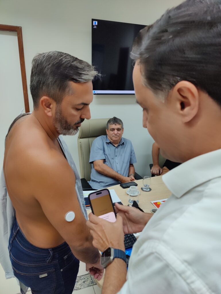 Ao testar o sensor na prática, Tyago Hoffmann foi indagado: “Doeu?” Ele rebateu, de imediato: “Nada!”. E aceitou o desafio de usá-lo pelos próximos 14 dias. Durante esse período, ele poderá acompanhar suas variações glicêmicas em tempo real, acessar gráficos detalhados sobre os níveis de glicose e entender melhor como a alimentação e outras condições influenciam esse controle. Tudo por meio de um aplicativo no celular, baixado durante a reunião.