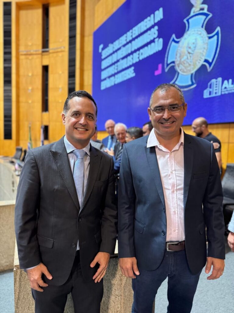 O deputado estadual Fabrício Gandini (PSD) concedeu hoje (11), na Assembleia Legislativa, a Comenda Domingos Martins ao prefeito eleito de São Mateus, Marcus Azevedo Batista, o Marcus da Cozivip (Podemos).